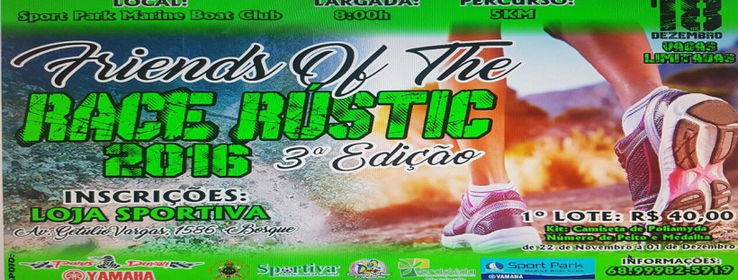 Olá amigos a equipe Running Acre convida a todos os corredores a participar da 3º edição da corrida Friends of the Race Rustic 2016 que será realizando no dia 18 de dezembro na Sport Park Marine Boat Club com largada as 08:00h.